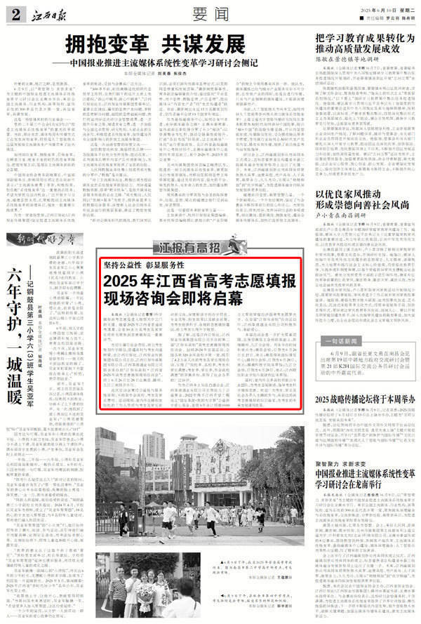 r为切实履行社会责任,助力考生规划升学路径,搭建高校与考生沟通桥梁,由江西日报社、江西报业传媒集团有限公司主办,江西日报传媒集团有限公司、江西李渡酒业有限公司联合承办的“江报有高招·江西省2025年高考志愿填报现场咨询会”,将于6月26日至28日在南昌、赣州、九江三地同步举行。